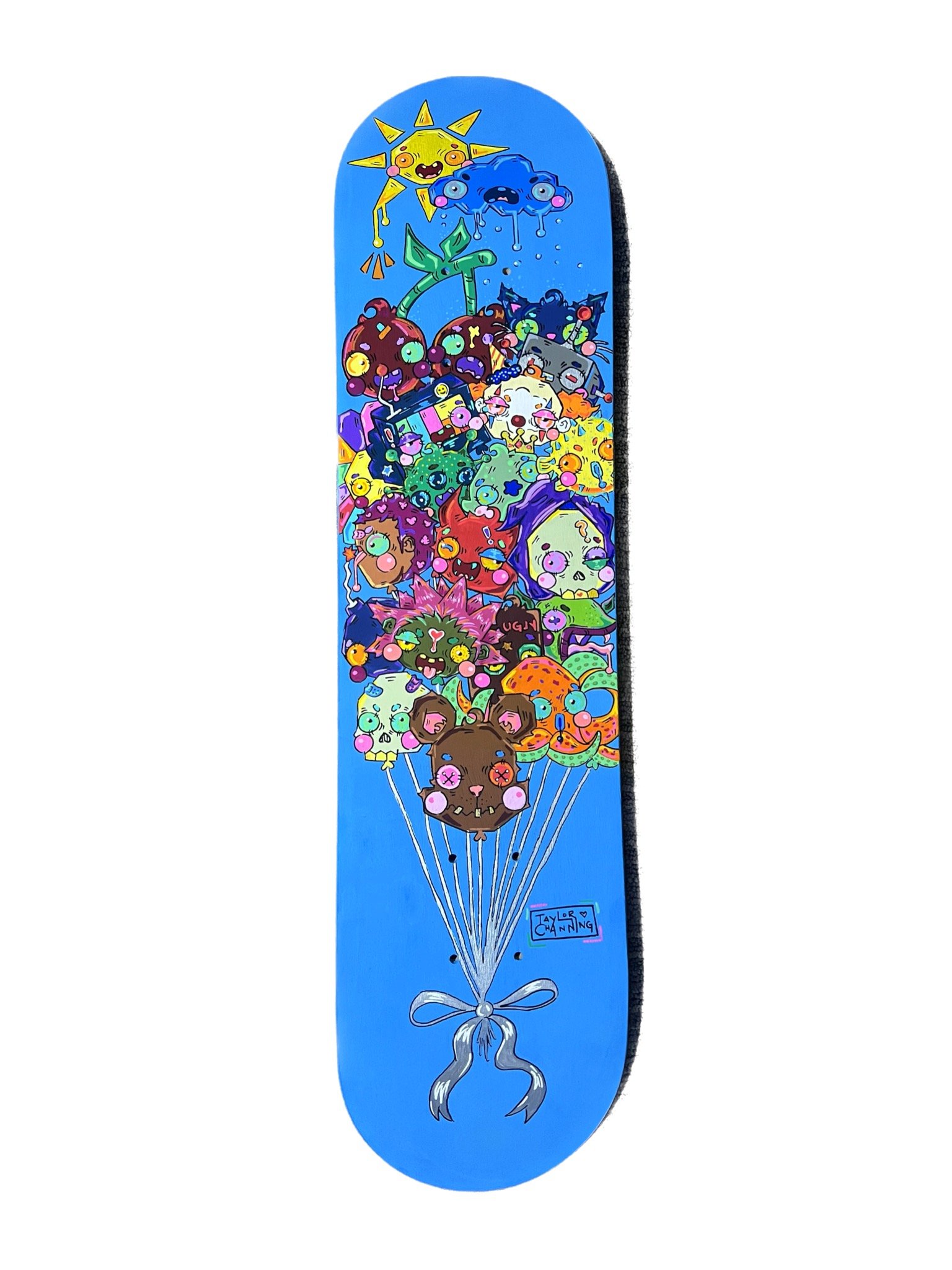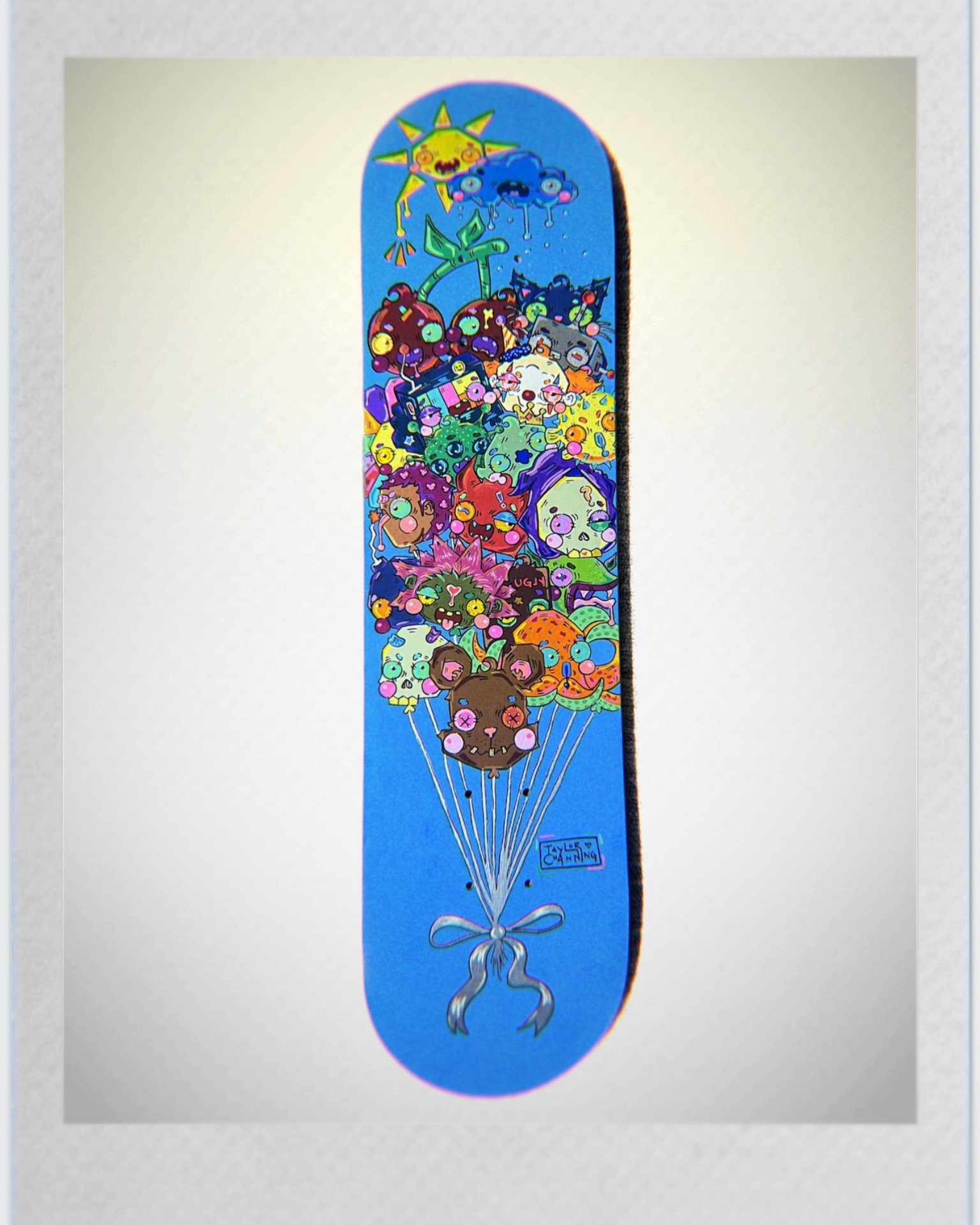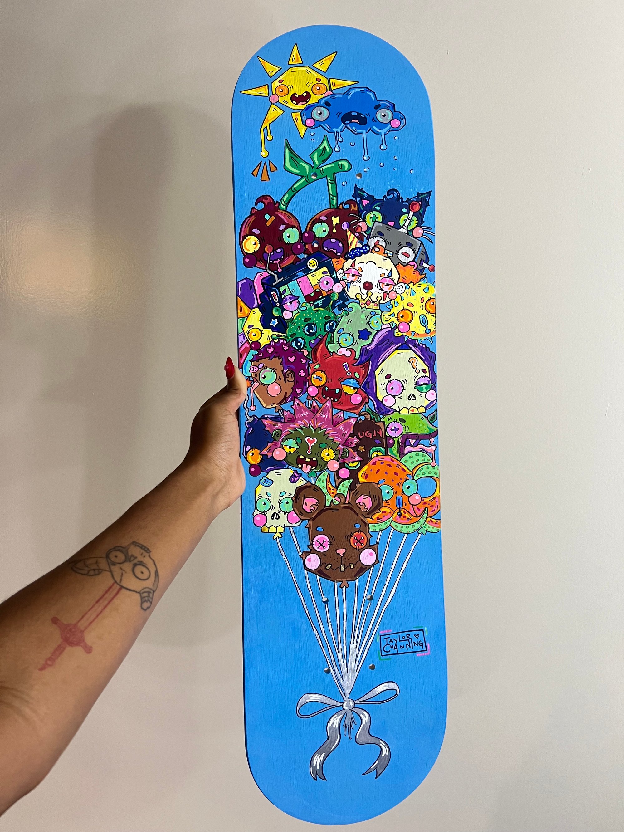 Acrylic and Water-Based Paint Markers on Skateboard Canvas.